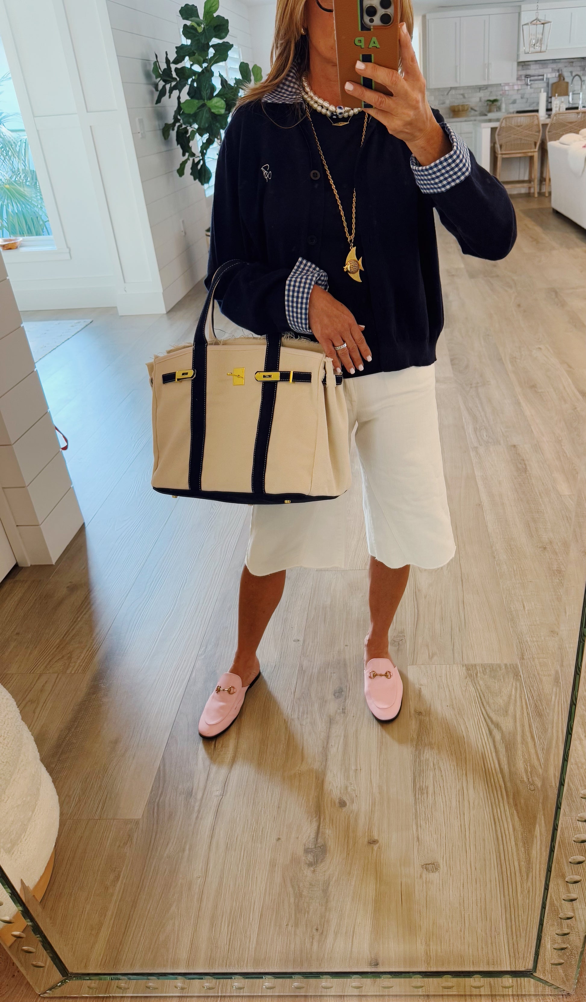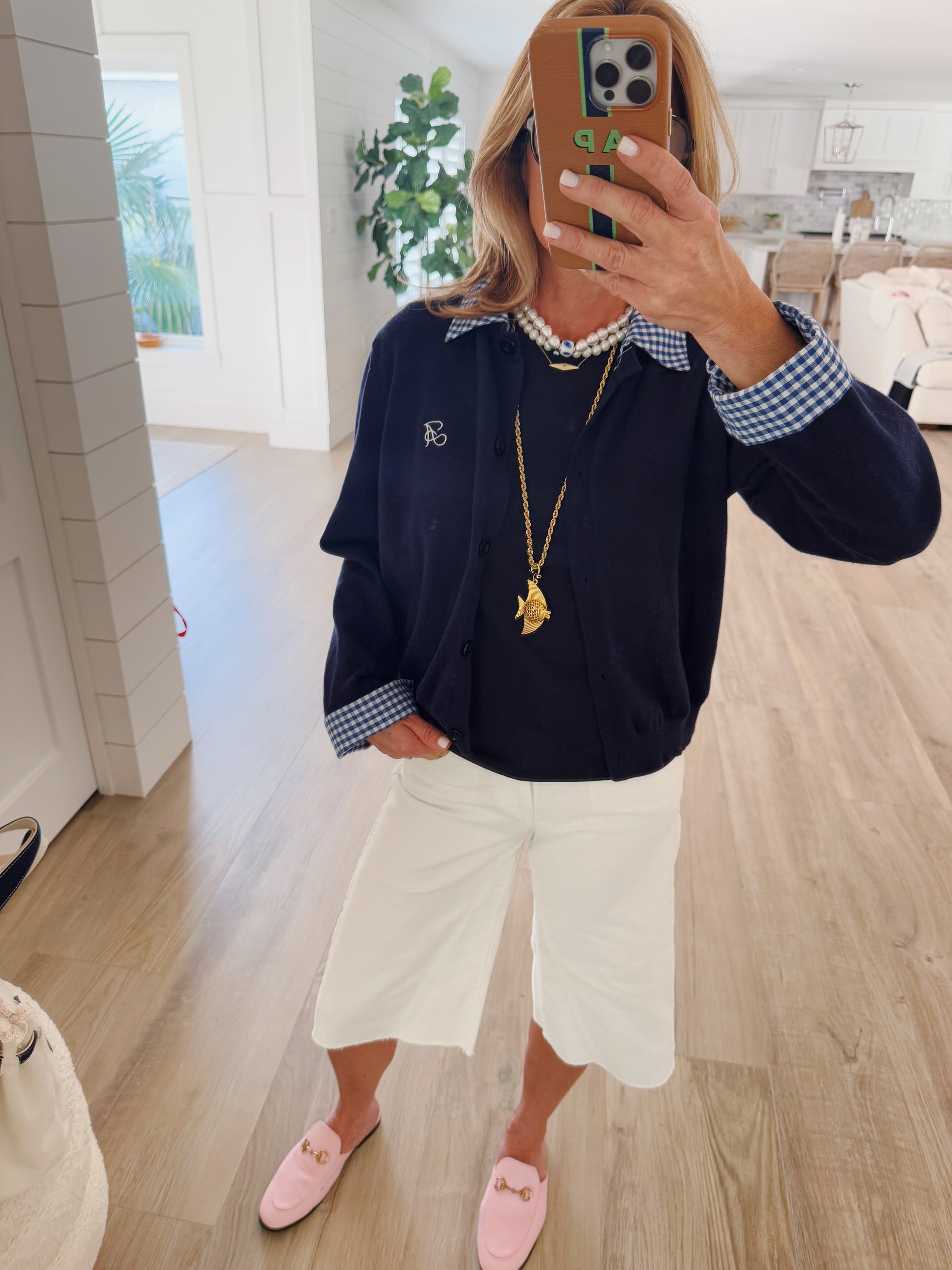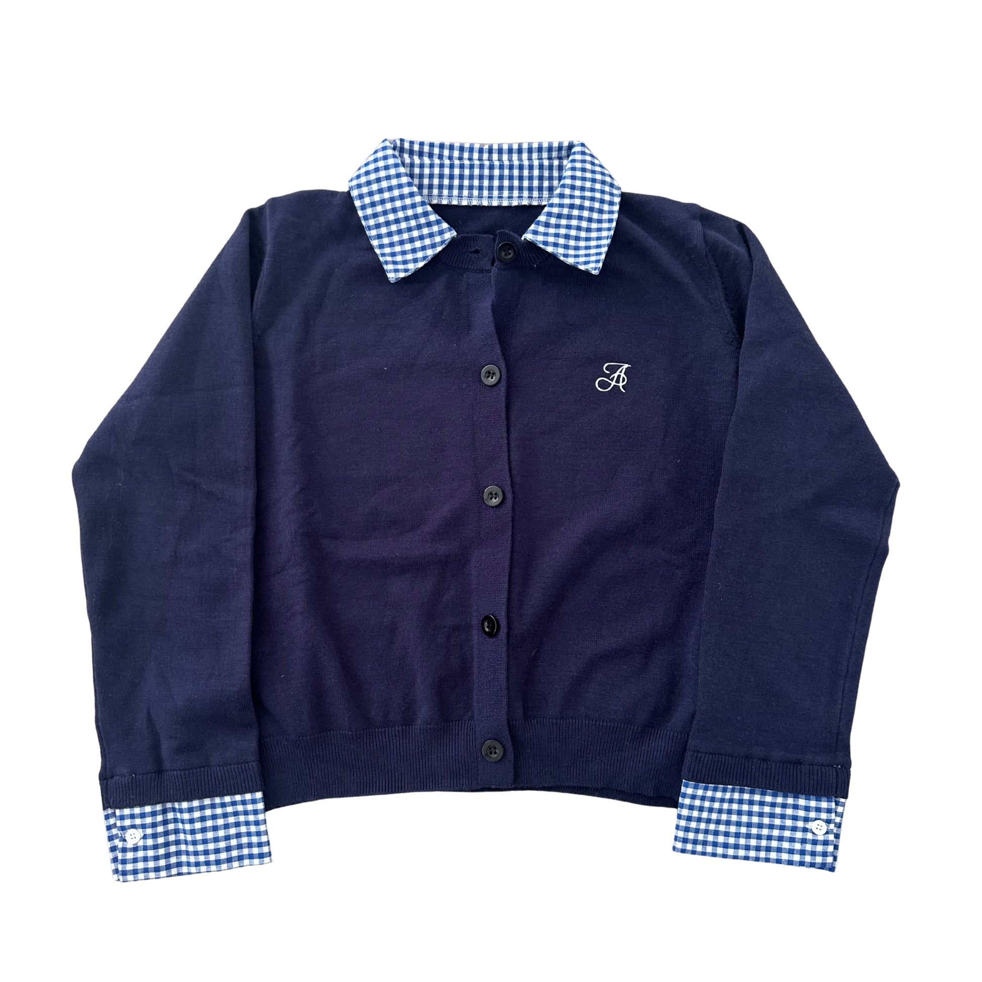• This classic knit cardigan is a perfect transitional piece. With its gingham collar and cuffs, it’s not your basic cardigan.