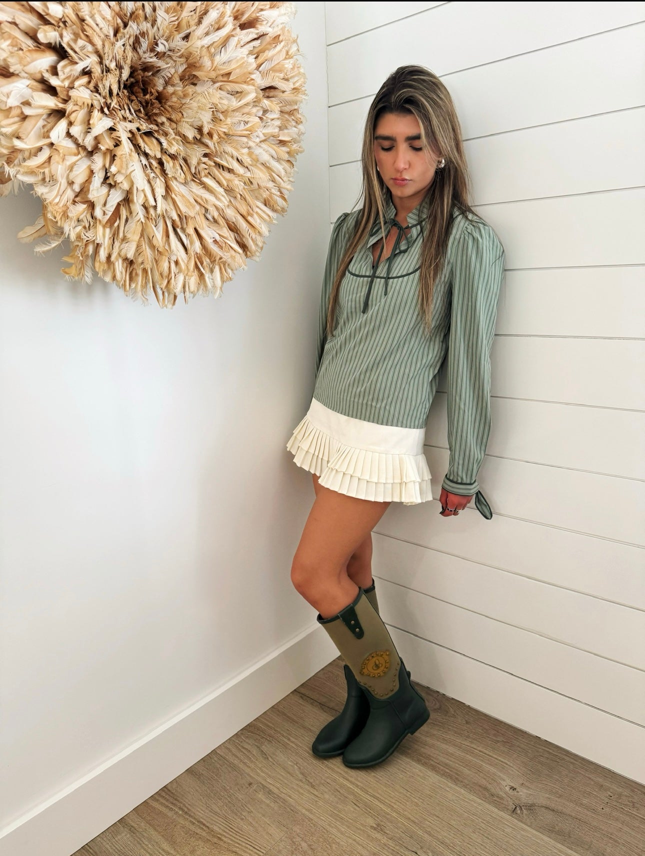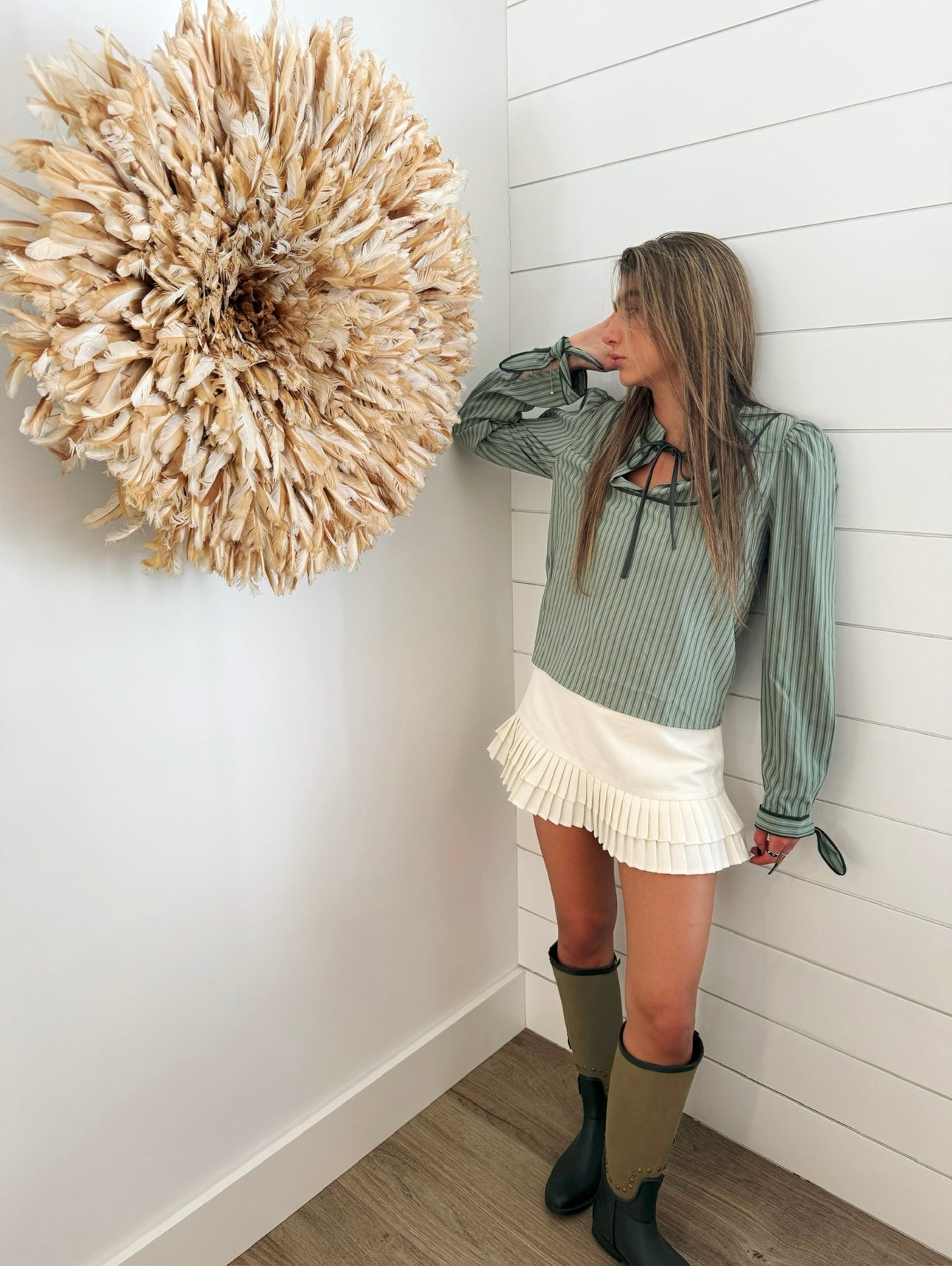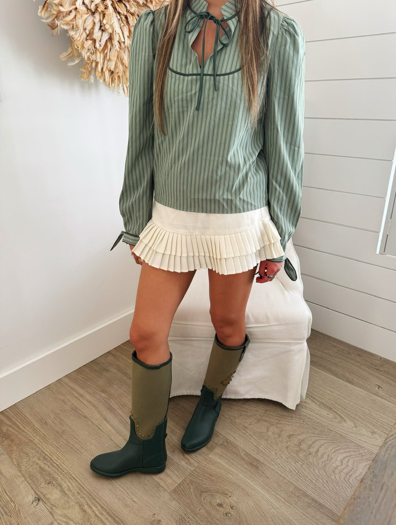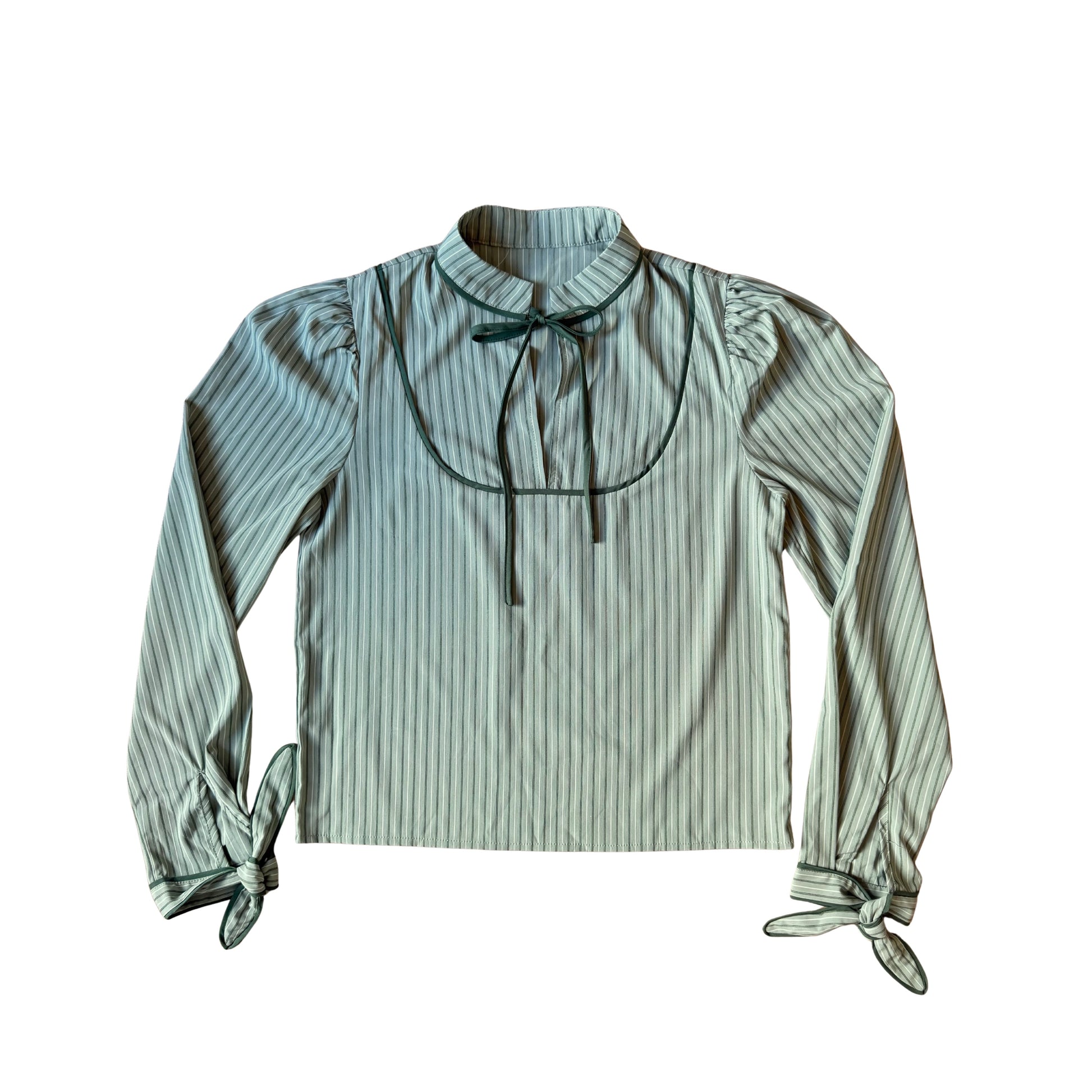 - Long sleeve blouse in tonal green-on-green stripes