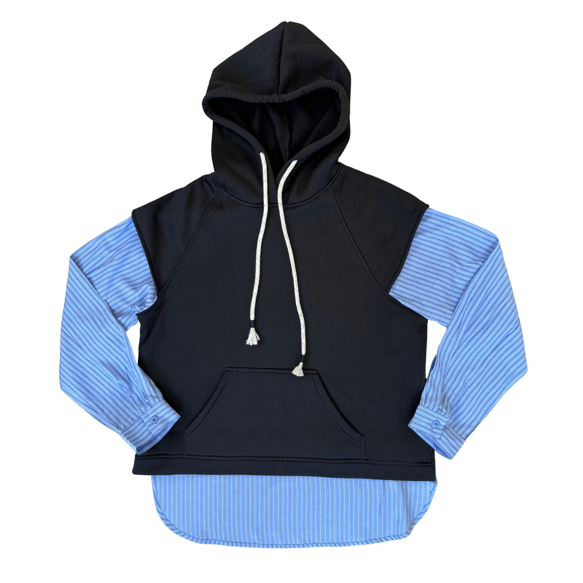 Style: A 2-in-1 pullover blending sporty hoodie comfort with tailored blouse sleeves