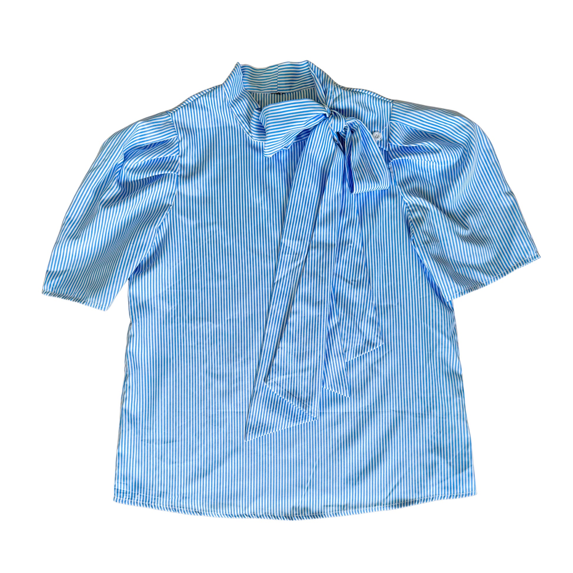 * A light fabric blouse featuring short sleeves and a large bow detail at the front. The blouse is designed with shoulder buttons, adding a unique touch to its casual yet stylish look."