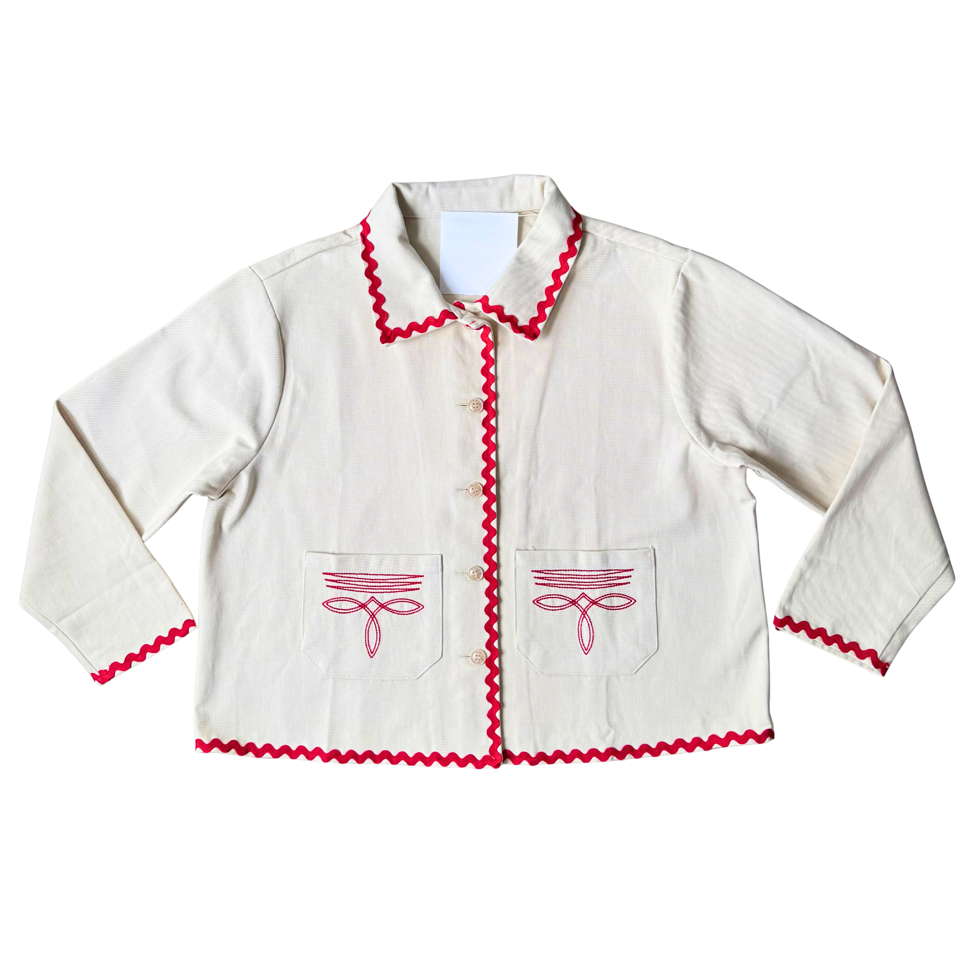 Cream button-up jacket with bold red rickrack trimming along the collar, front, cuffs, and hem