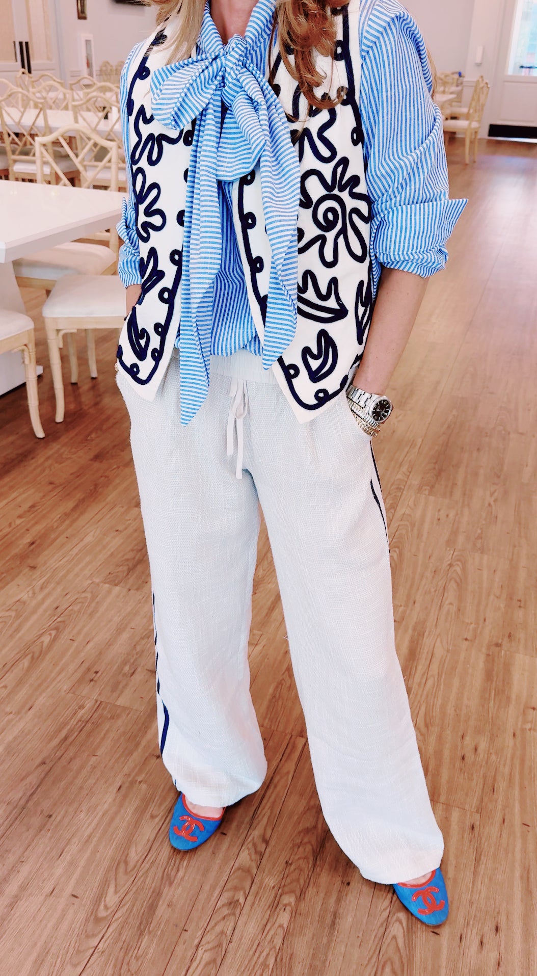 * This luxurious vest combines a rich cream base with intricate navy blue embroidery, creating a striking contrast. The thick fabric adds warmth and structure, while the detailed embroidery brings an elegant, artisanal touch. Perfect for layering , this versatile piece exudes a timeless, nautical-inspired charm, offering both comfort and style."
