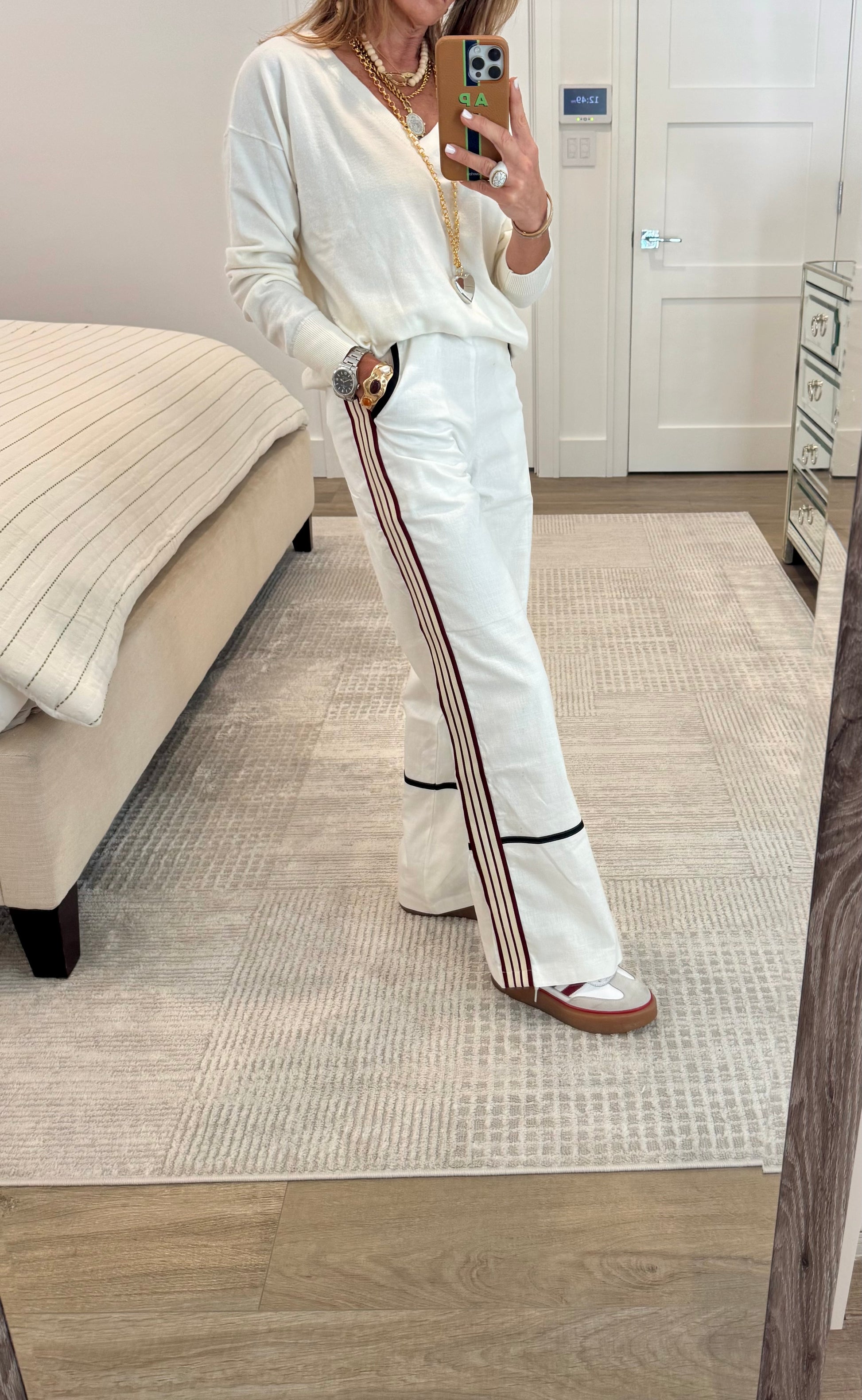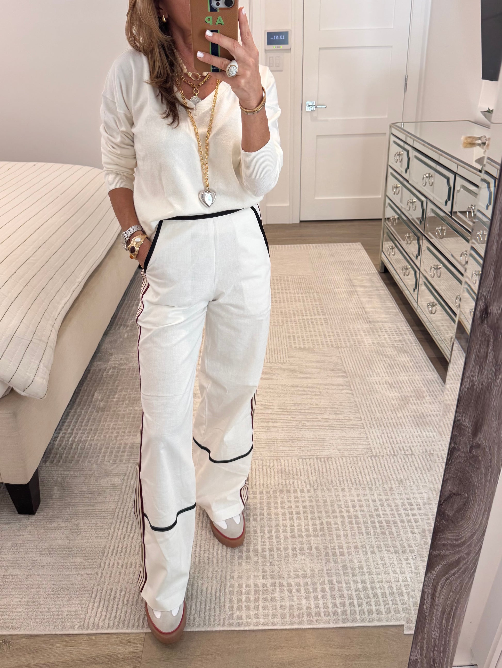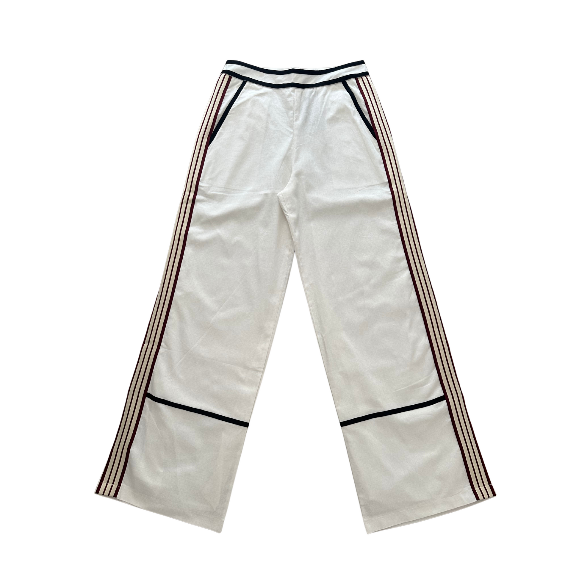 White high-waisted pants with a sporty, relaxed feel. Zips up the back