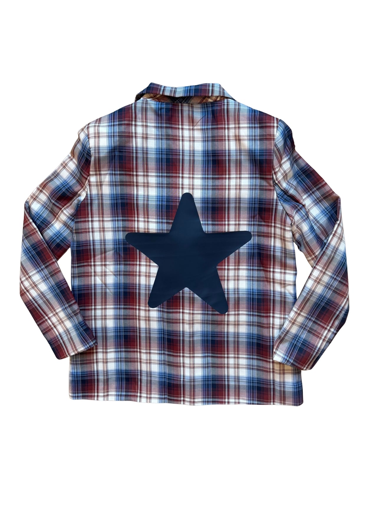 - Tailored plaid blazer with a bold oversized star motif on back.
