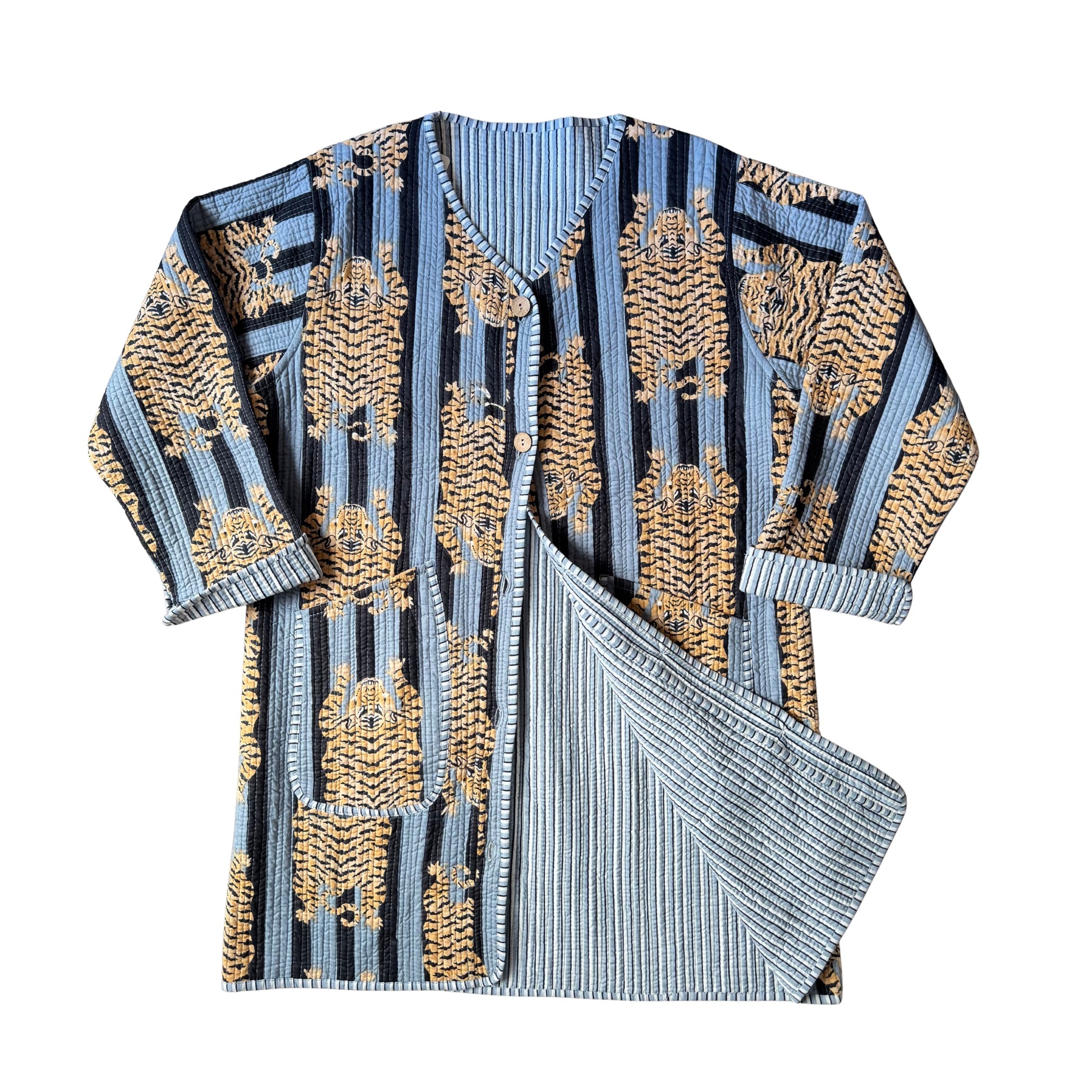 Reversible quilted coat featuring an all-over tiger motif on one side + striped contrast print on the reverse