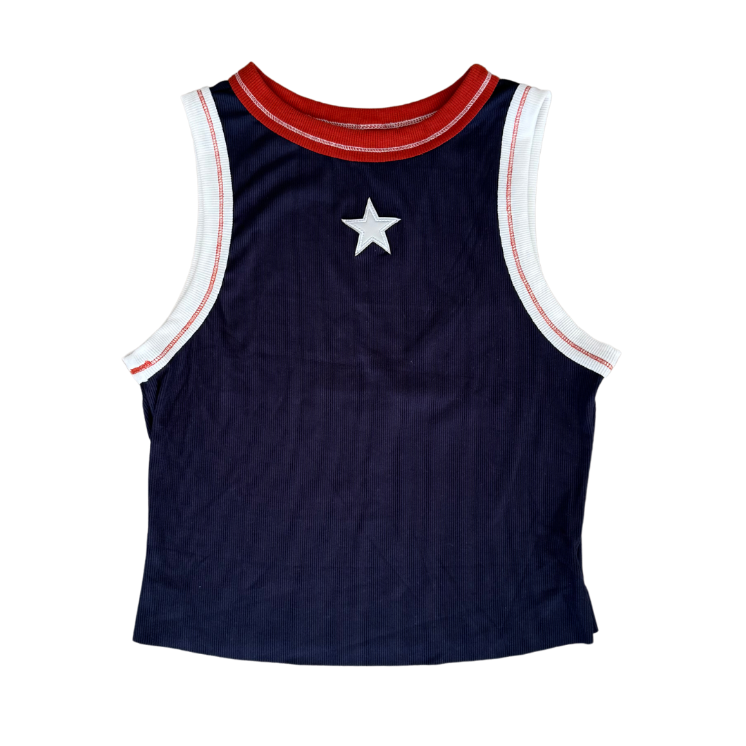 A navy tank top with a bold white star applique and sporty red and white ribbed trim, combining comfort with retro-inspired Americana style.
